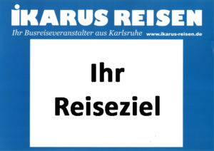 Wir führen unsere Reisen mit angemieteten Bussen zuverlässiger Partnerunternehmen durch. Dadurch sind nicht alle diese Fahrzeuge mit IKARUS beschriftet. An den Bussen ist allerdings grundsätzlich hinter der Windschutzscheibe ein gut sichtbares, großes IKARUS Plakat mit Angabe des Reiseziels angebracht. Sollten Sie dennoch unsicher sein, fragen Sie bitte beim Fahrer nach.