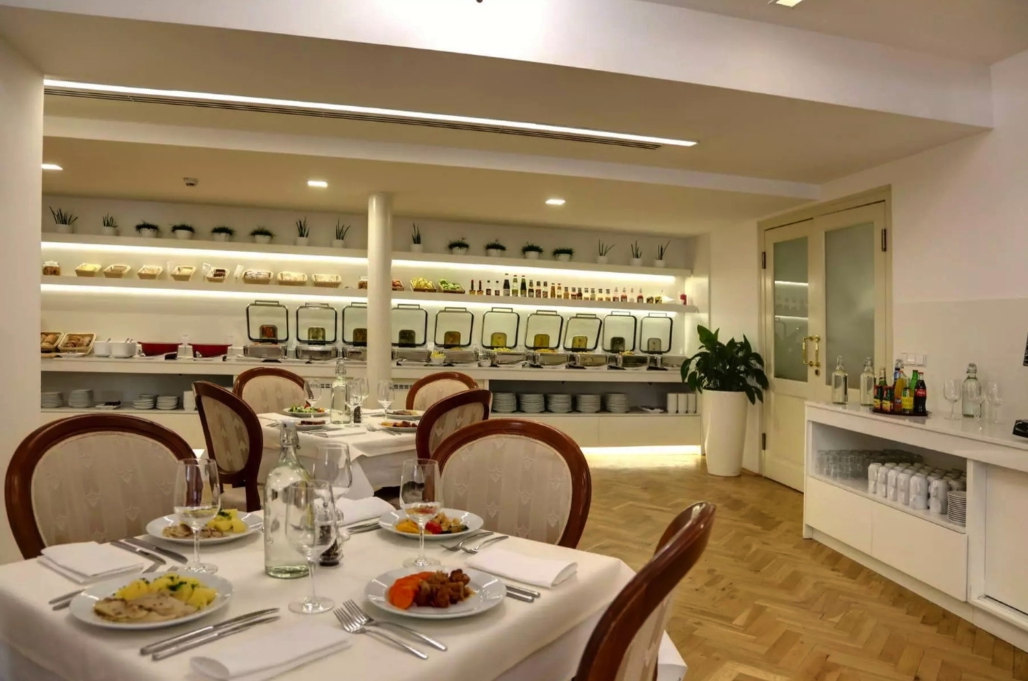 Zimmer: Der Hotelkomplex besteht aus fünf miteinander verbundenen Gebäuden und verfügt über 104 gemütliche Zimmer. Diese sind alle mit Bad oder Dusche/WC, Fön, LED-Sat.-TV, Radio, Telefon, kostenfreiem Internetzugang (WLAN), Kühlschrank, Leihbademantel, Pantoffeln und Safe ausgestattet. Die Zimmer der Kategorie Komfort Plus (Aufpreis € 49,- pro Person und Woche) bieten Ihnen zusätzlich eine Aussicht auf die Mühlen-Kolonnade. Aufpreis für die größeren Superior-Zimmer: € 140,- pro Person und Woche.