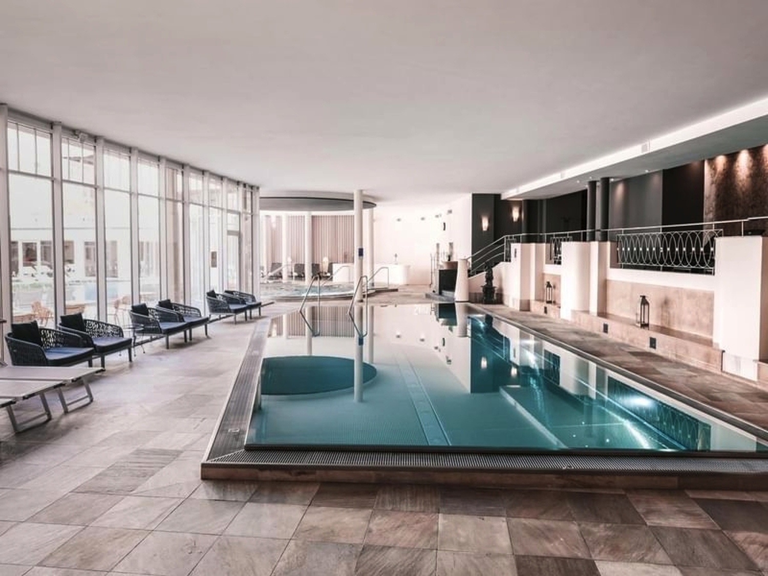 Kur und Wellness: Den Gästen steht eine bestens ausgestattete 2.500 m² große Spa- und Wellnessabteilung zur Verfügung. Großer Poolbereich mit beheiztem Außen- (17 x 7 m, ca. 30°C) und Innenpool (13 x 7 m, ca. 30°C) sowie Aktiv- und Solepool (4 x 2 m). Saunalandschaft mit finnischer Sauna, Biosauna, Dampfbad, Infrarotkabine. Moderner ausgestatteter Cardio-Fitnessraum. Zahlreiche Gesundheits-, Kur-, Schönheits- und Wellnessanwendungen werden hier angeboten. 12 statt 10 Kuranwendungen pro Woche im Preis enthalten.
