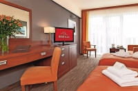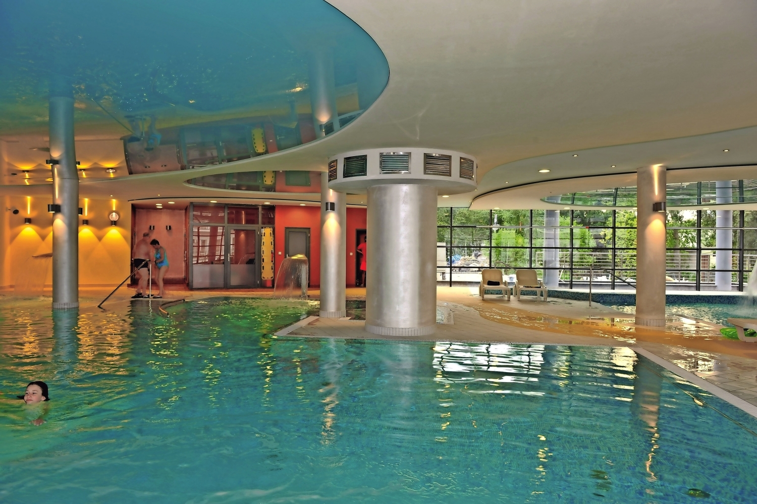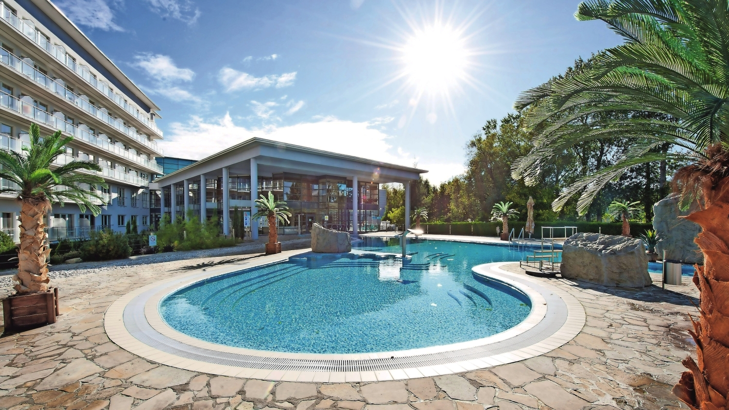 Kur und Wellness: Die Kur-Behandlungen (Massagen, Bäder, Laser- und Kryo-Therapie, Ultraschall, Sollux-Lampe, Paraffin-Umschläge und Gymnastik) werden in den hoteleigenen Behandlungsräumen durchgeführt. Zudem stehen außerhalb der Therapiezeiten ein großes Innenbecken (16 x 12 m, ca. 30°C), ein Außenbecken (geöffnet von Juli bis August), Sauna, Dampfbad, Whirlpool und ein Fitnessraum zur Verfügung. 2 Kuranwendungen pro Werktag (Mo.-Fr.) nach medizinischer Vorgabe inklusive.