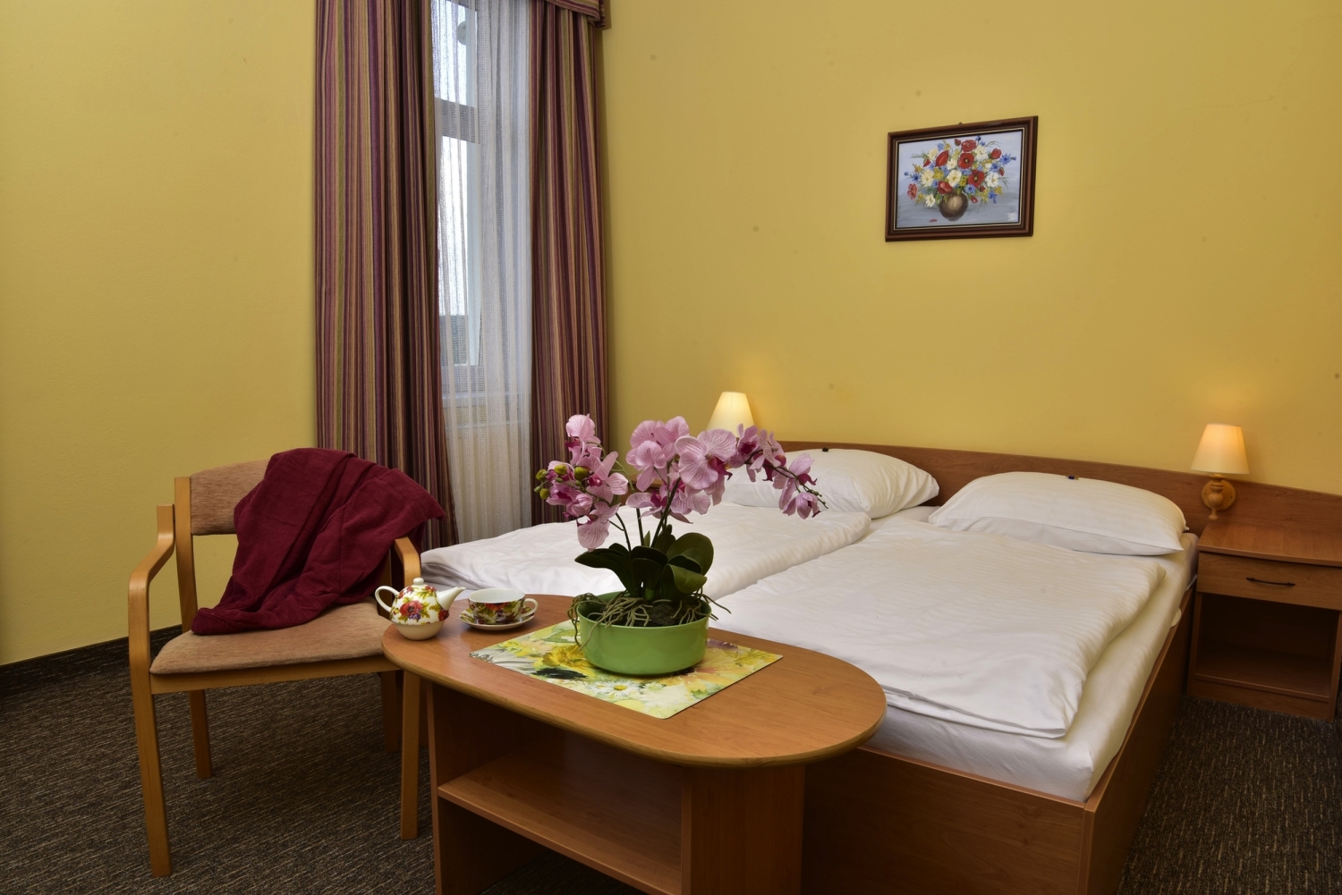 Zimmer: Alle 30 Zimmer des Hotels sind gemütlich eingerichtet und verfügen über Bad oder Dusche/WC, Fön, Sat.-TV, Telefon, WLAN, Kühlschrank und Safe (gg. Gebühr). Zimmer mit Blick zum Goetheplatz gehören zur Kategorie Superior und können gegen Aufpreis von € 49,- pro Person und Woche gebucht werden. Superior-Zimmer mit Balkon gegen Aufpreis: € 84,- pro Person und Woche. Ein barrierefreies Zimmer ist auf Anfrage buchbar. Doppelzimmer zur Alleinbenutzung: € 245,-.