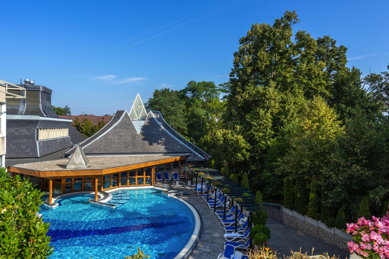 Allgemeine Informationen: Dieses beliebte Kurhotel (früherer Name: Thermal Hotel Heviz) mit Stil und Atmosphäre liegt ca. 600 Meter vom Heilsee entfernt und bietet ein hoteleigenes Kurzentrum (alle Anwendungen im Haus). Ihnen stehen zwei bedeckte Thermalbäder (33 °C und 37°C) und eine Schwimmhalle, außerdem Whirlpool, Unterwasser-Streckung und ein Dampfbad zur Verfügung. Neu gestalteter Saunabereich (finnische Sauna, Bio-/Aroma-Sauna, Infrarotkabine, Erlebnisdusche), Salzgrotte gegen Gebühr. Erlebnisbad (ca. 200 m² Wasserfläche) im Garten mit Unterwassermassagen, Wasserfall, Geysir, Thermalbecken mit Sonnenterrasse (Mai bis September) und finnische Gartensauna. Insgesamt stehen den Gästen somit 6 verschiedene Becken zur Verfügung! Für die Hotelgäste wird täglich (außer sonntags) kostenlos Morgengymnastik und Wassergymnastik in Gruppen angeboten. Bademantelbenutzung und Begrüßungscocktail inklusive. Außerdem E-Bike-Verleih, Café, Bierstube, Grillterrasse, Friseur, Souvenirshop, Sauna, Solarium, Nutzung des Premier Fitness Clubs, Tennisplätze in der Nähe und ein geschlossener Hotelparkplatz. Gelegentlich stimmungsvolle Live-Musik. Gratis WLAN im gesamten Hotel verfügbar. Kosmetik-Studio mit Sothys Gesicht- und Körperbehandlungen. Das komplette Haus ist rauchfrei.