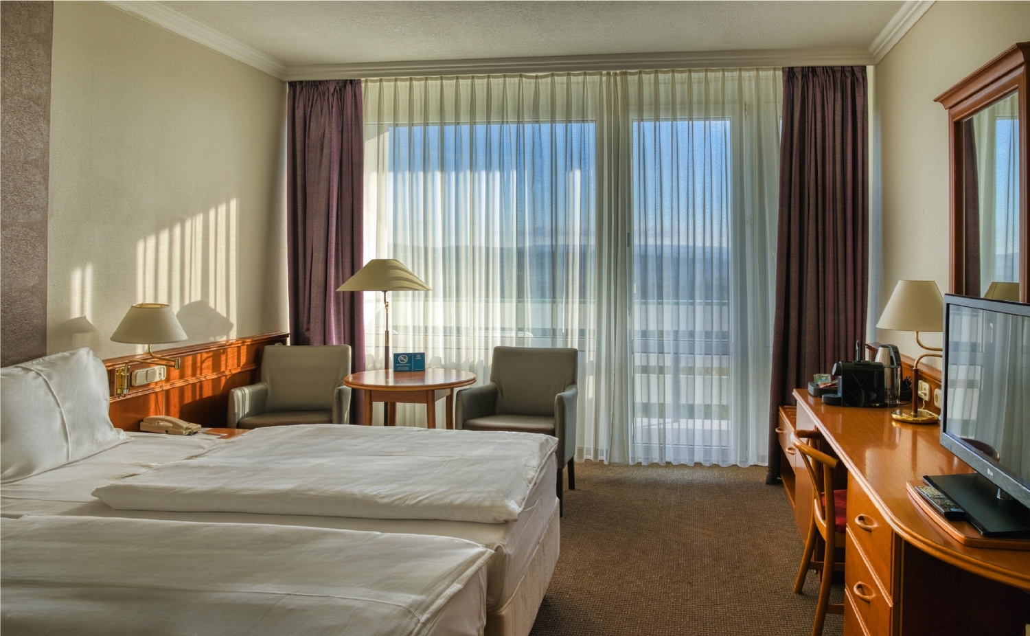 Zimmer: Alle Standard-Zimmer sind klimatisiert und verfügen über Bad/WC, Sat.-TV, WLAN, Telefon, Minibar, Safe, Haartrockner, Bademantel und einen Balkon mit Blick auf den Garten oder die Stadt. Zimmer mit Verbindungstür und für Allergiker stehen ebenso zur Verfügung wie Zimmer für Gehbehinderte. Optional sind auch Superior-Zimmer in der 5., 6. oder 7. Etage mit Parkblick buchbar (Aufpreis im Doppelzimmer € 10,- pro Person und Nacht, im Einzelzimmer Preis auf Anfrage).
