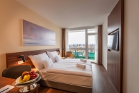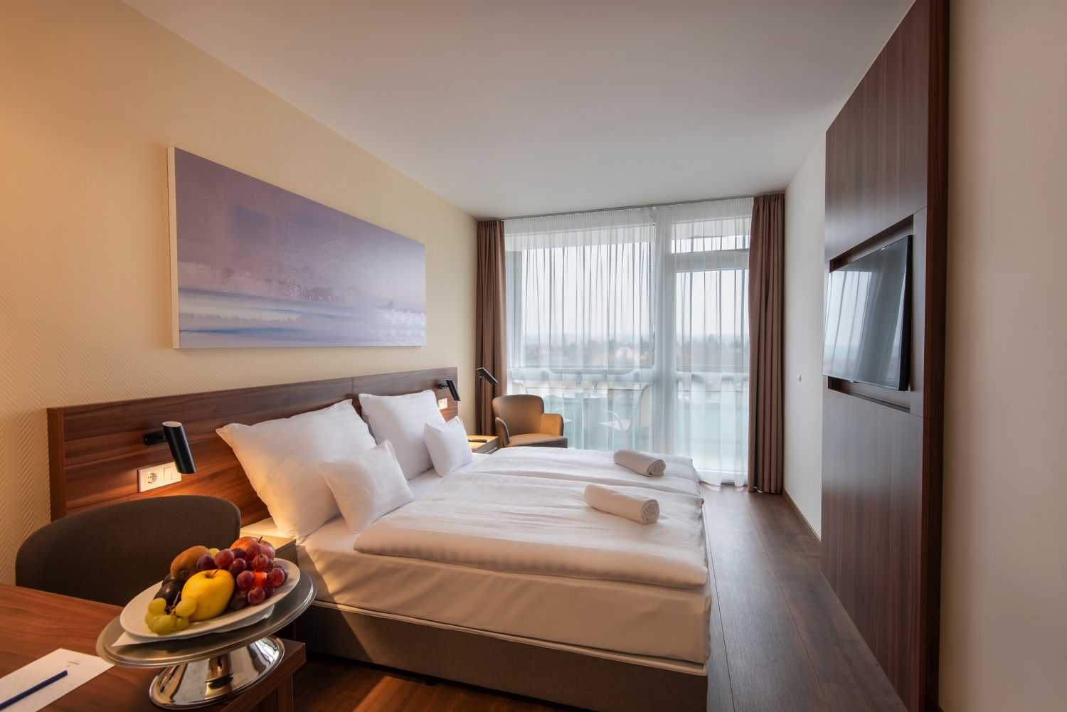 Zimmer: Die modern und in freundlichen, hellen Farben ausgestatteten Standard-Zimmer sind eingerichtet mit Badezimmer und Dusche, regulierbarer Klimaanlage, Sat.-TV, Minibar, WLAN, Safe, Telefon und möbliertem Balkon. Leihbademantel inklusive. Optional buchbar: Superior-Zimmer mit Seeblick für € 12,- pro Person/Nacht.
