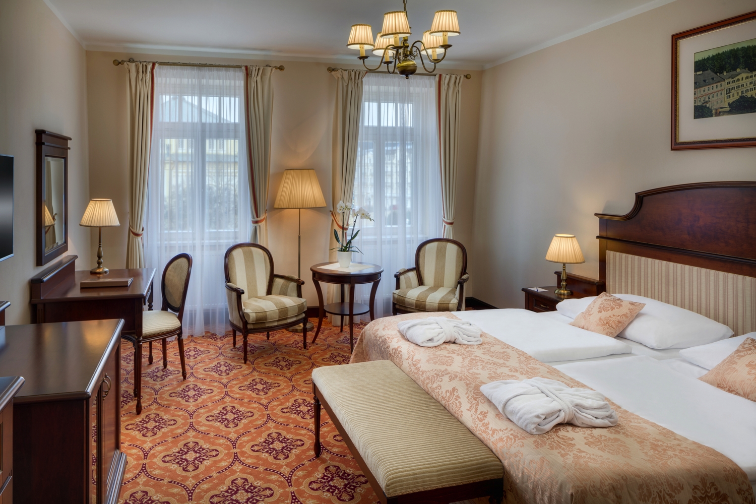 Lage: Das ****+Resort besteht aus den drei Häusern Hvĕzda, Imperial und Neapol, die durch Korridore miteinander verbunden sind. Hier wohnen Sie sehr zentral, aber dennoch ruhig in der Nähe der Kolonnaden und der Singenden Fontäne, direkt am Goetheplatz. Die Hauptpromenade Marienbads ist in kurzer Zeit zu Fuß erreichbar.