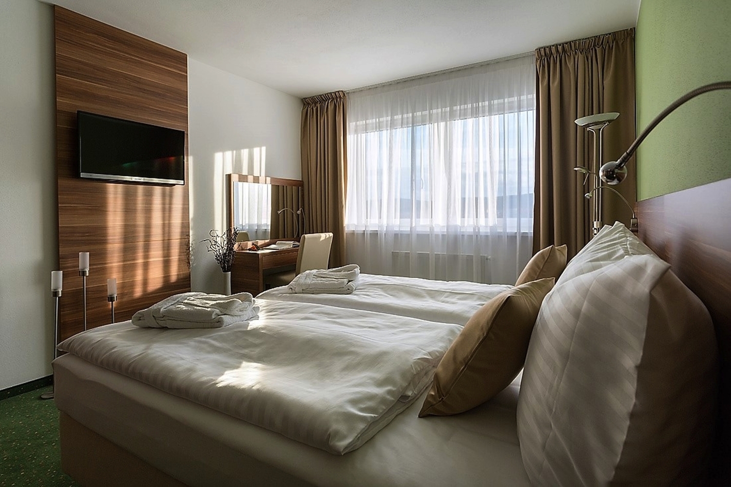 Zimmer: Die 56 Zimmer des Hotels Pyramide sind modern gestaltet und verfügen über Dusche/WC, Fön, Kosmetikspiegel, Sat.-TV, Telefon, kostenfreien Internetzugang (WLAN), Minibar, Safe und Balkon mit Panoramablick.