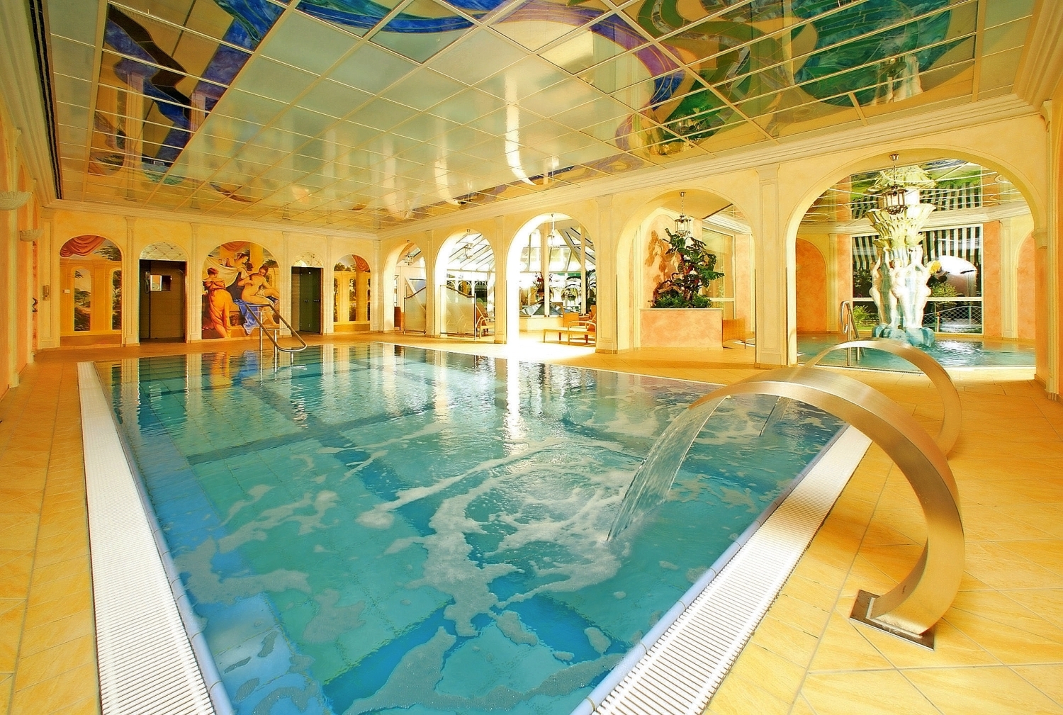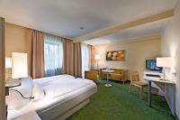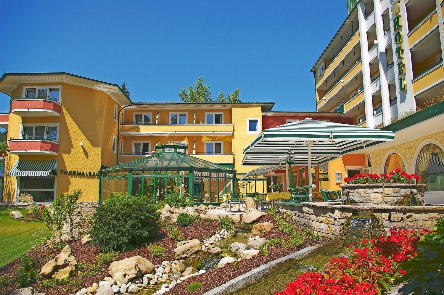 Kur und Wellness: Im Wellnessparadies des Hotels bietet man Ihnen vielfältige Möglichkeiten zum Wohlfühlen. Dazu gehören ein Thermalbereich mit zwei Thermal-Hallenbädern (36°C und 30°C), einem Thermal-Freischwimmbad (28°C; geöffnet von März-November) mit Sprudelliegen, Massagedüsen und Wildquell. Zudem stehen ein Whirlpool und verschiedene Saunen, Ruhebereich, Erlebnisduschen, Wärmebänke, Fitnessraum und eine großzügige Liegewiese zur Verfügung. Oder Sie lassen sich in der Beauty-Farm von fachkundigen Händen verwöhnen (gg. Aufpreis). Das Angebot reicht von Ganz-, Akupunktur- oder Fußreflexzonen-Massage über Naturfango bis hin zu Chiro-Gymnastik. Sie erhalten 10% Rabatt auf die Buchung von Wellness-Anwendungen im Hotel. 1 x Eintritt Therme 1 (ca. 5 Std., ohne Saunabereich) pro Aufenthalt inklusive.