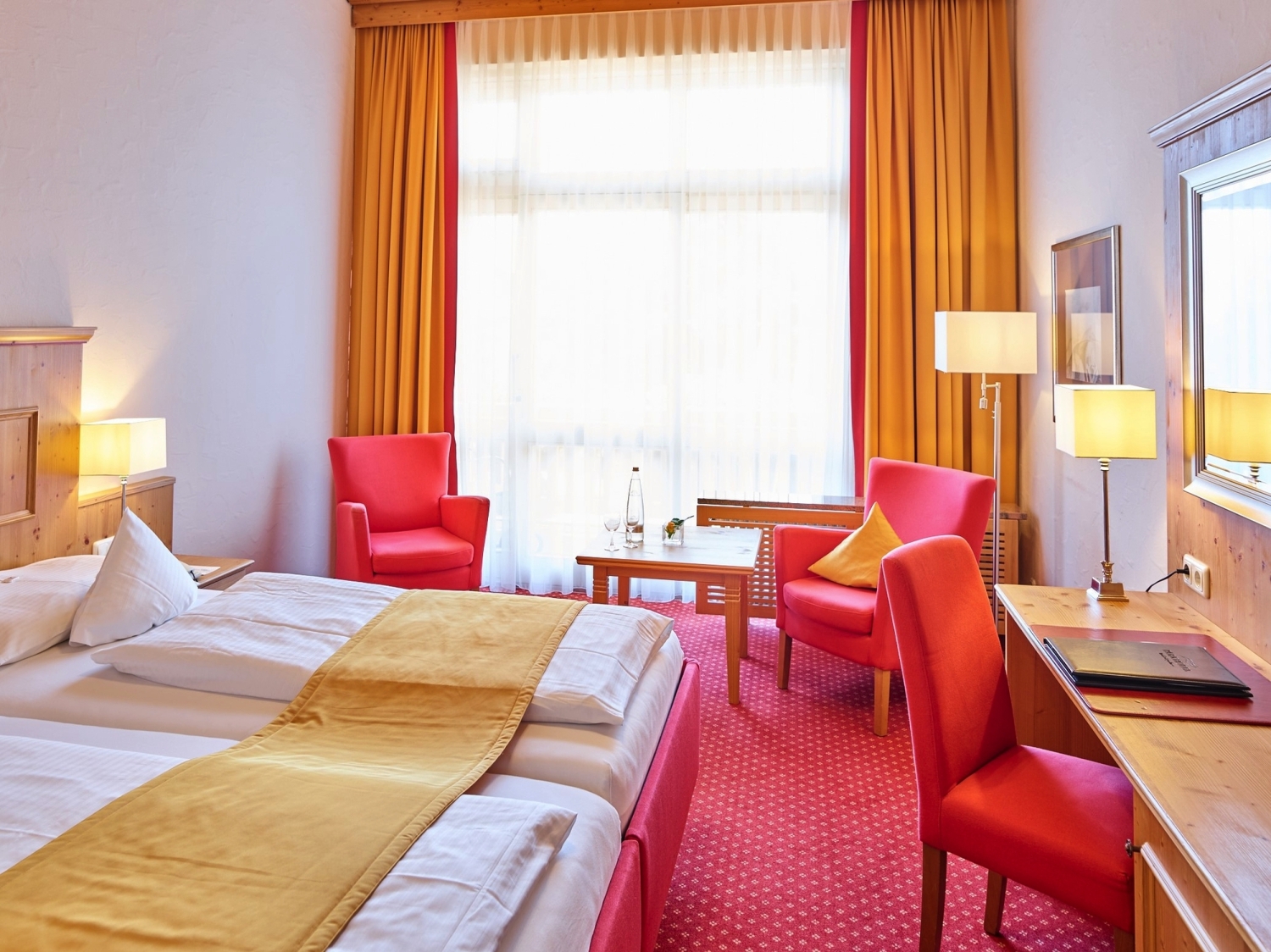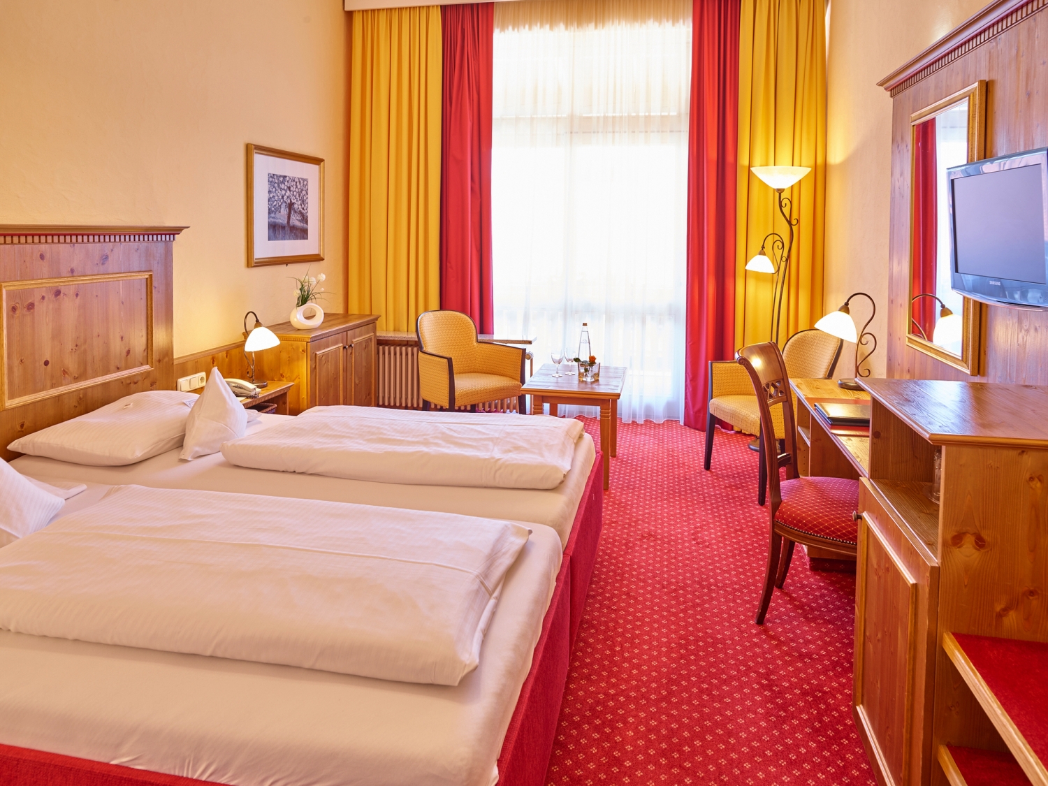 Zimmer: Die großzügigen Zimmer bieten jeglichen Komfort. Ausgestattet mit Dusche/WC, Balkon, Safe, Minibar, Kabel-TV, kostenlosem WLAN, Badetasche mit Bademantel & Frotteeslipper (leihweise) und XXL-Betten. Komfortzimmer gegen Aufpreis (€ 49,- p.P.) größer und mit Blick aufs Rottal. Superiorzimmer (€ 98,- p.P.) zusätzlich mit Kaffee- und Teeset.