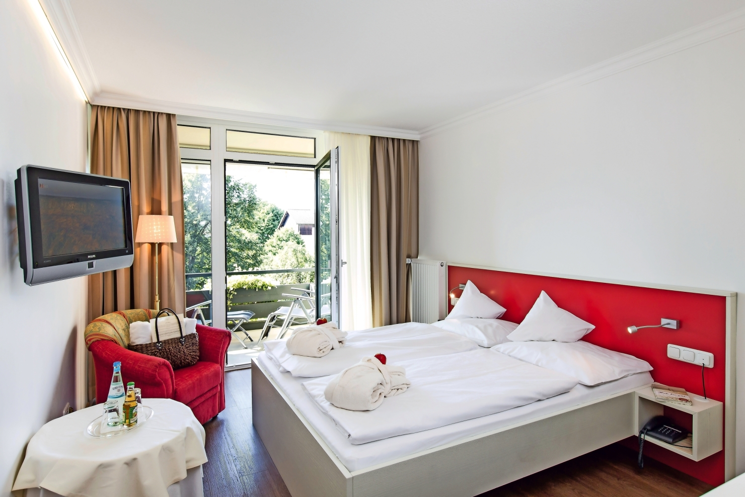 Zimmer: Die 59 freundlich gestalteten Zimmer verfügen über Bad oder Dusche/WC, Leihbademantel, Slipper, Badetasche, Fön, Sat.-TV, Radio, 1 Flasche Wasser, Telefon, kostenfreies WLAN, Safe, Minibar und Balkon und sind teilweise mit französischen Betten (1,60 x 2m) ausgestattet. Die Doppelzimmer „Sonnenblick“ (Aufpreis € 105,- pro Person und Woche; bei Alleinbenutzung € 455,- pro Woche) sind etwas größer und verfügen zudem über einen Südbalkon. Aufpreis Doppelzimmer Standard zur Alleinbenutzung: € 280,- pro Woche.